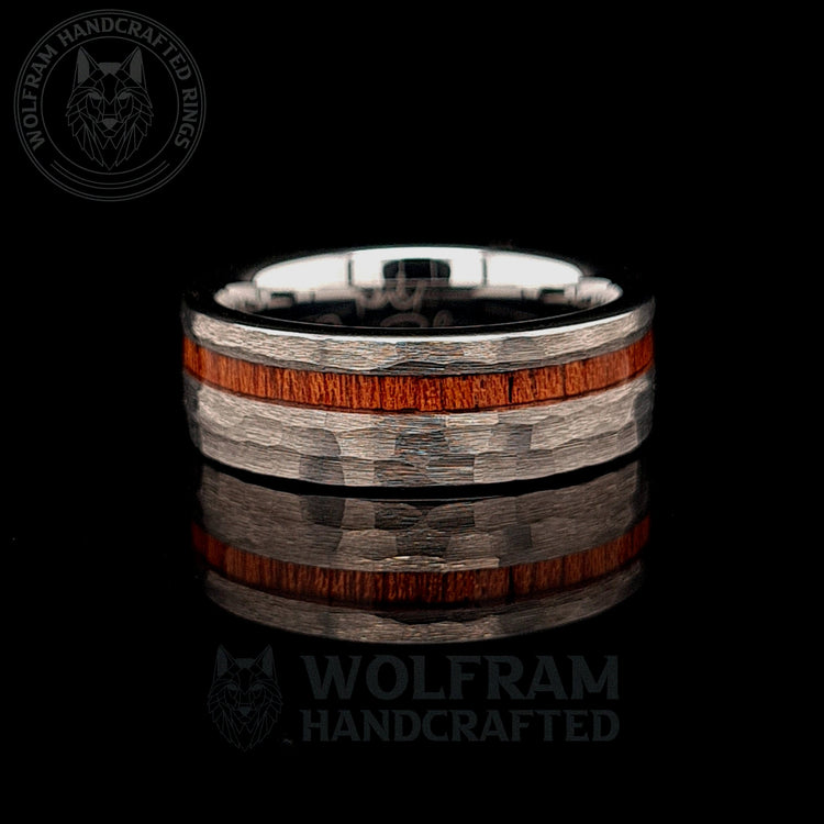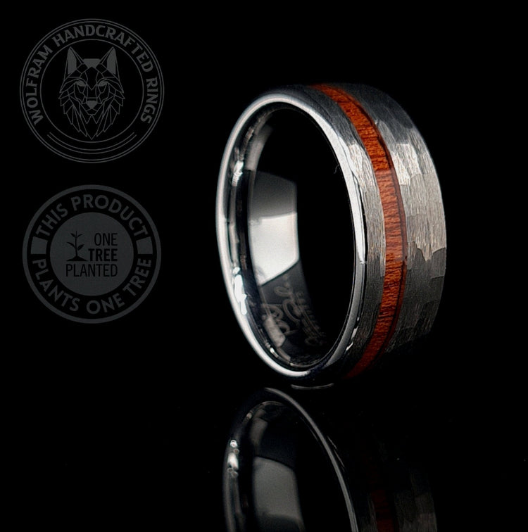 This 8mm wide ring is inlaid with valuable Hawaiian Koa wood. It features a Hammered surface that catches the light without being too 'in your face' with a Diamond Brushed finish. Since we use real wood the pattern changes slightly for each ring. The wood inlay is protected by our clearcoat Ring Armourâ„¢ to protect it from moisture and damage. The 'Destry' is a classy ring fit for any occasion yet tough enough for everyday wear and the perfect conversation starter.