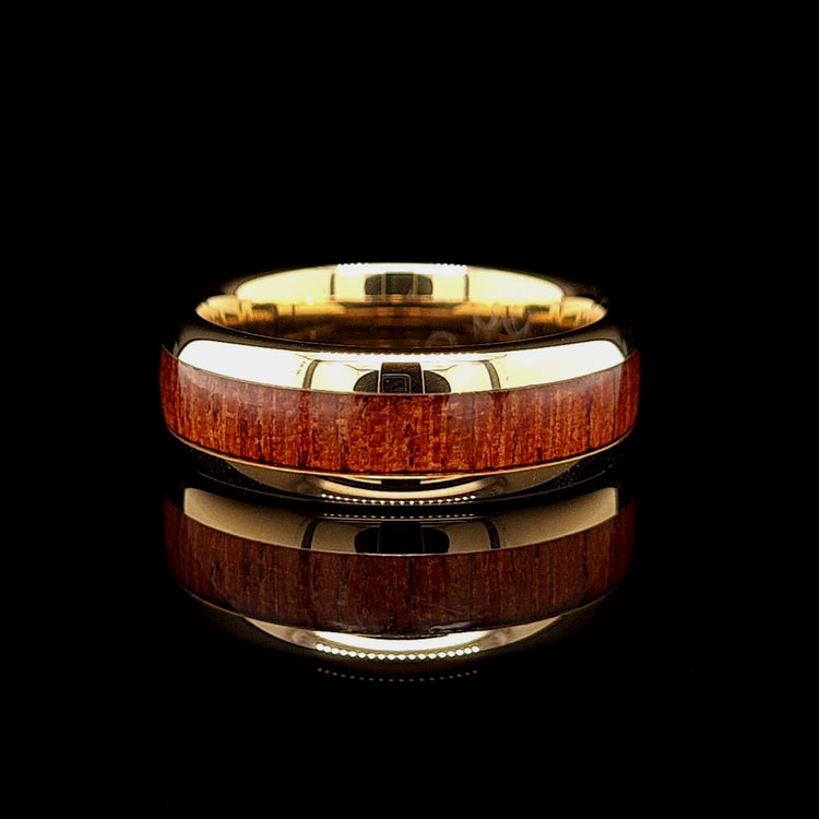 Materials: Tungsten Carbide, Koa Wood, 18K IP (Ion Plated) Yellow Gold.