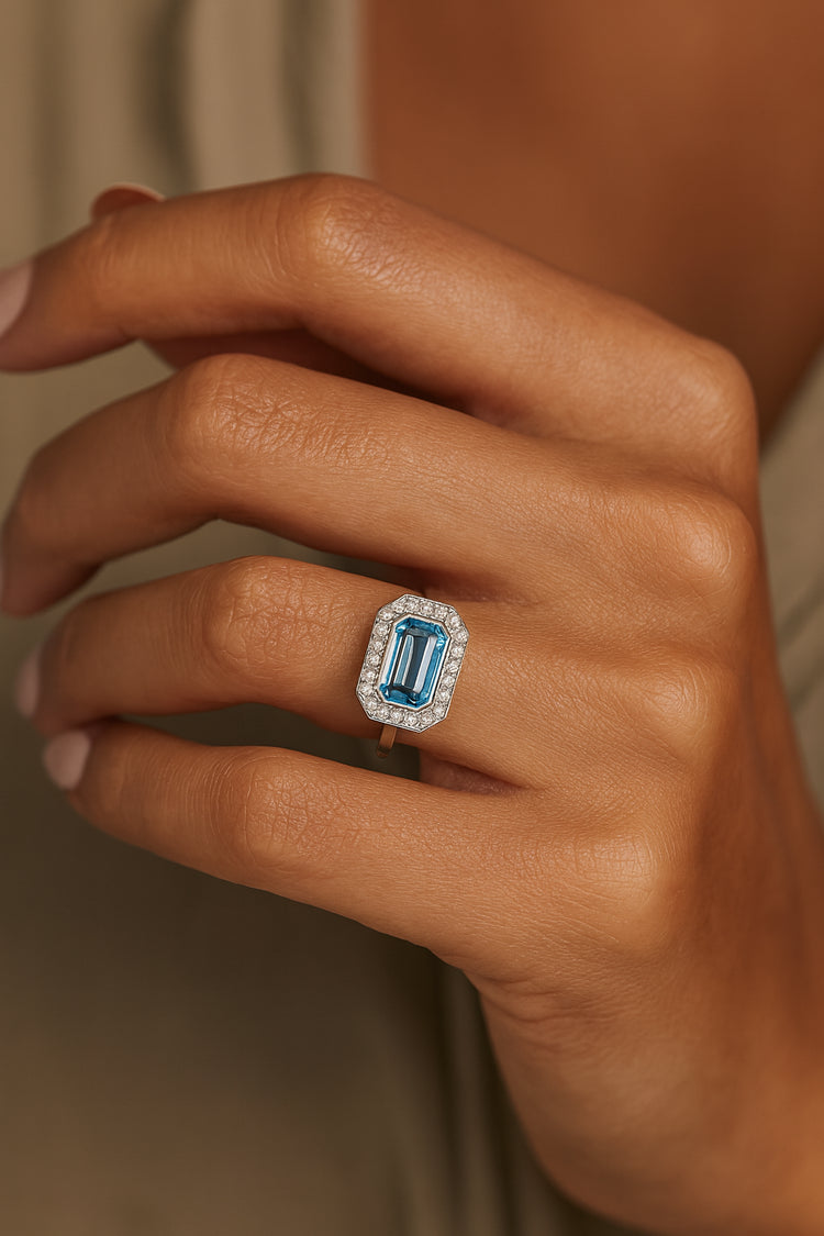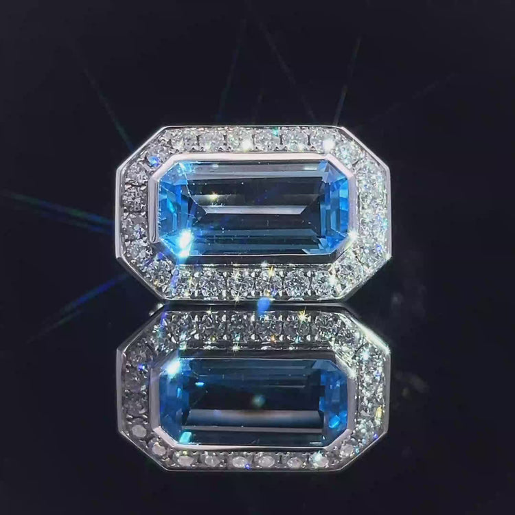This exquisite piece features a dazzling Swiss Blue Topaz and a sparkling Moissanite halo, set in solid Sterling Silver. The intricate details and high-quality materials make this a timeless and elegant addition to any jewelry collection. Expertly crafted with precision and care, this piece exudes luxury and sophistication.