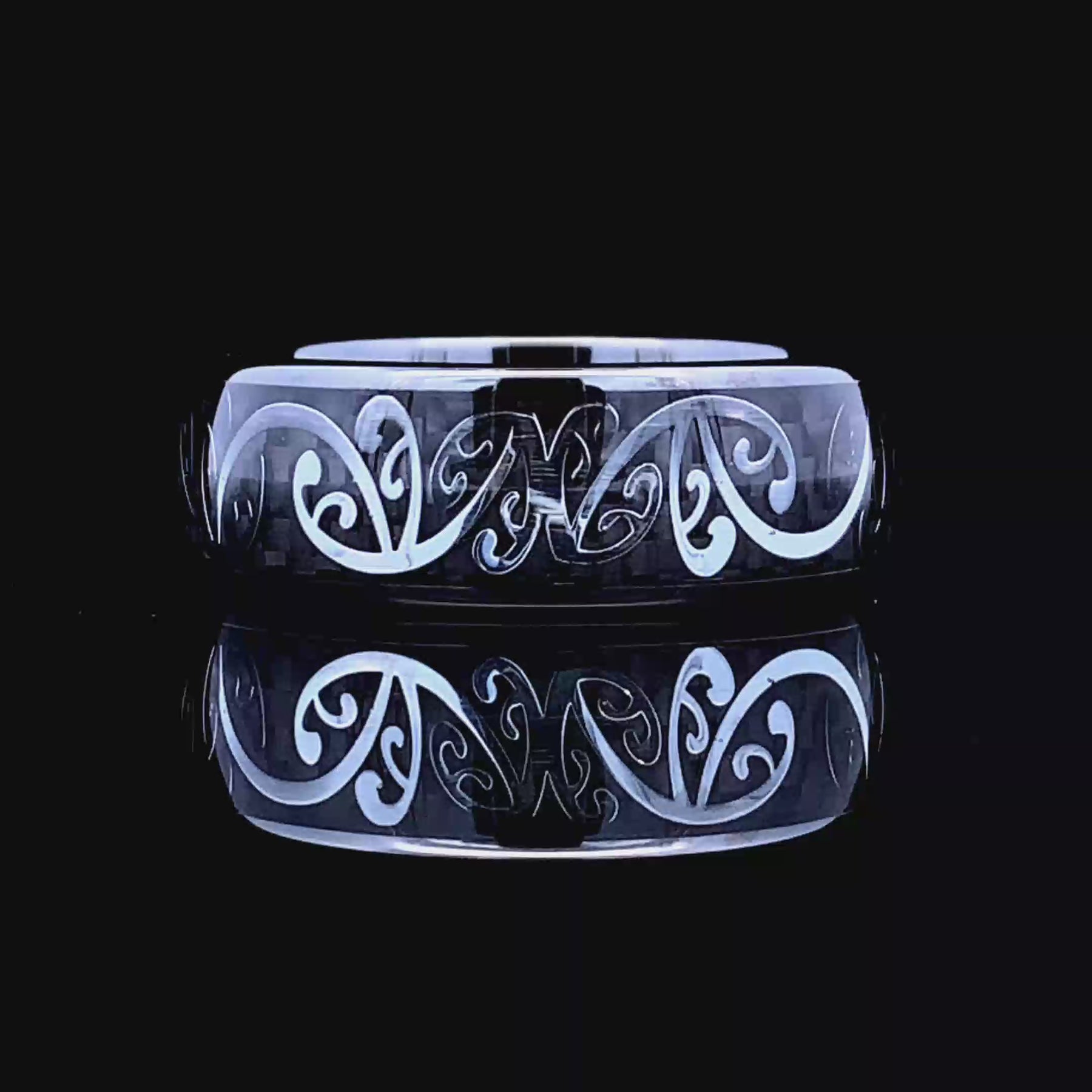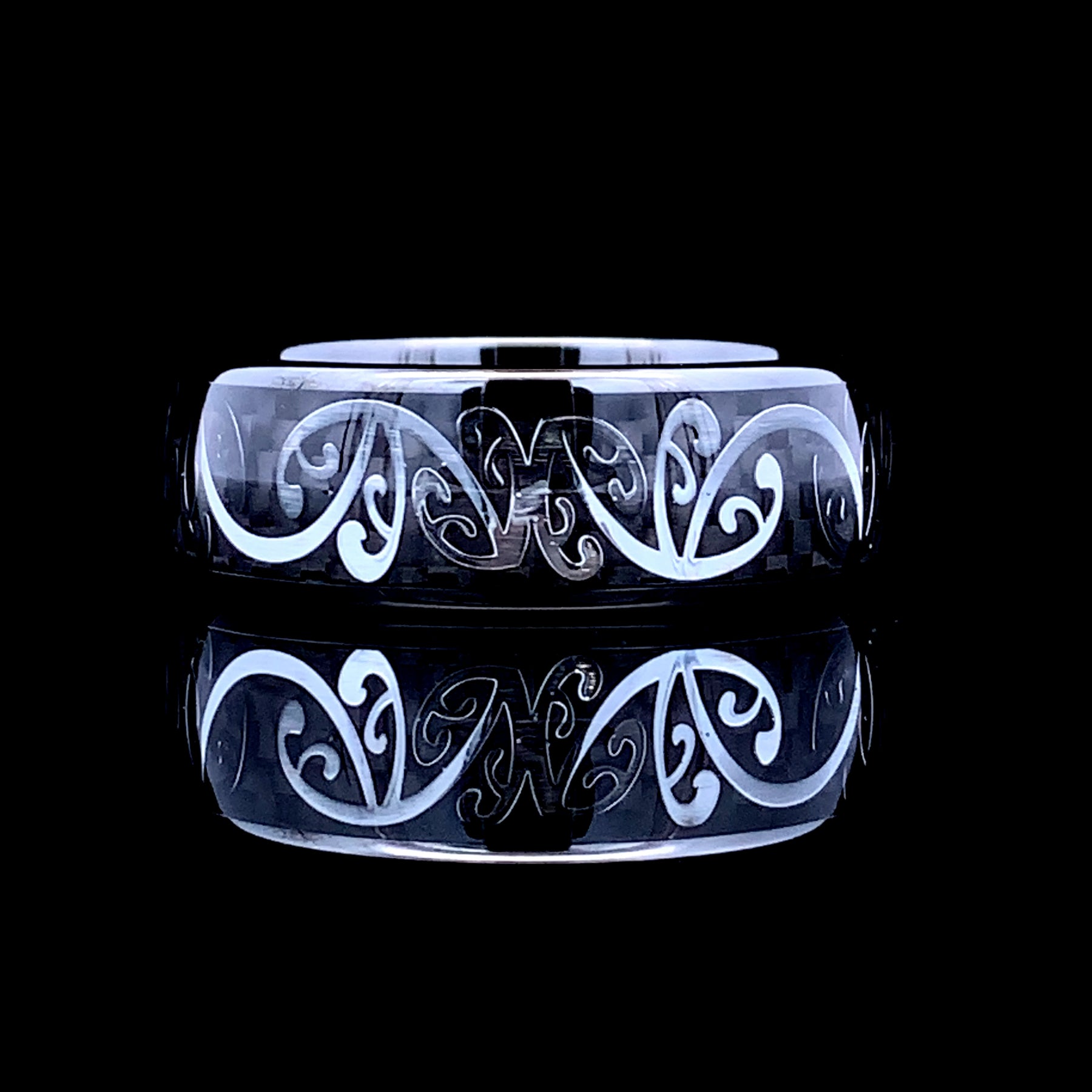 This version of our popular Koru Ring features High Polish, Black rounded edges with an inlay of Carbon Fiber Weave and a Brushed, White Gold colour Koru pattern protected by our waterproof Ring Armour™. With very little maintenance this ring will keep its pristine appearance for years to come.