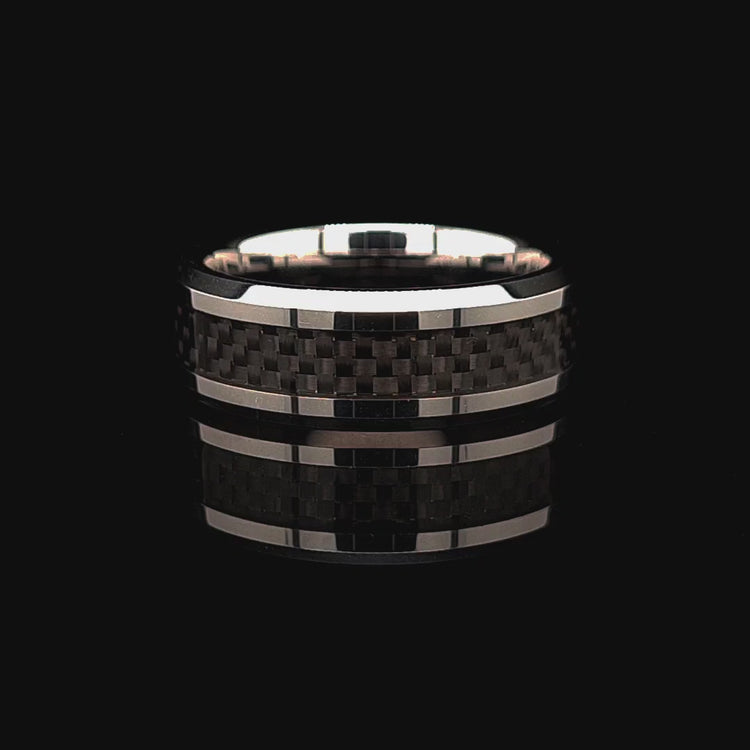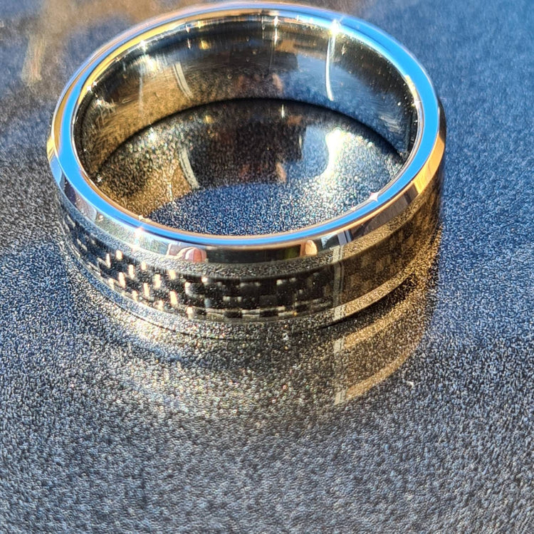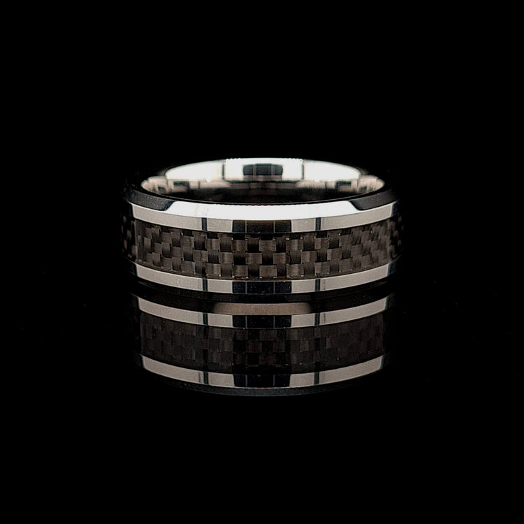 The Justin Ring features a high shine polished finish with Beveled edges & inlaid with genuine aerospace grade Carbon Fiber protected by our clearcoat Ring Armour™ to protect it from moisture and damage.