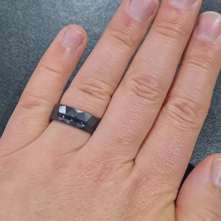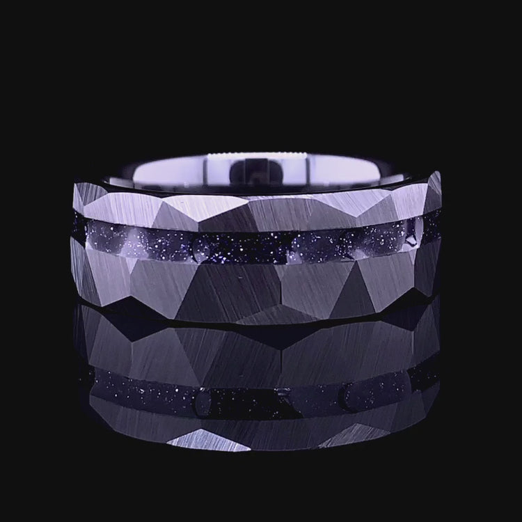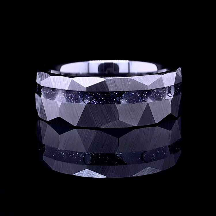 Experience the powerful protection of The Midnight Guardian. This ring features a stunning Blue Sandstone inlay, symbolizing strength and clarity. The brushed and randomly hand-faceted design adds a touch of elegance to this statement piece. Feel confident and shielded everytime you slip it on your finger.