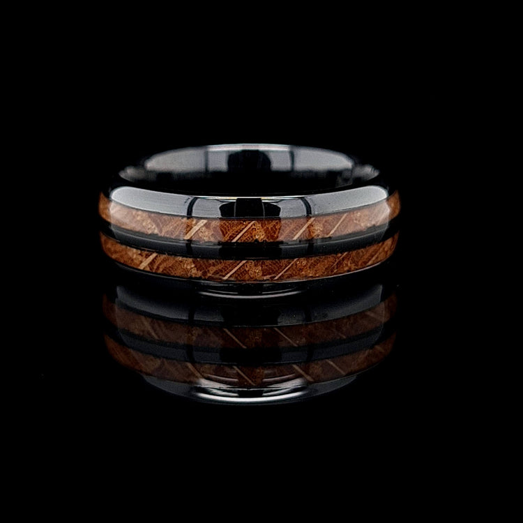 This 8mm wide ring is inlaid with twin rows of genuine reclaimed Oak Whiskey Barrel wood. Since we use real wood the pattern changes slightly for each ring. The wood inlay is protected by our clearcoat Ring Armour™ to protect it from moisture and damage. The 'Jameson' is a classy ring fit for any occasion yet tough enough for everyday wear and the perfect conversation starter.