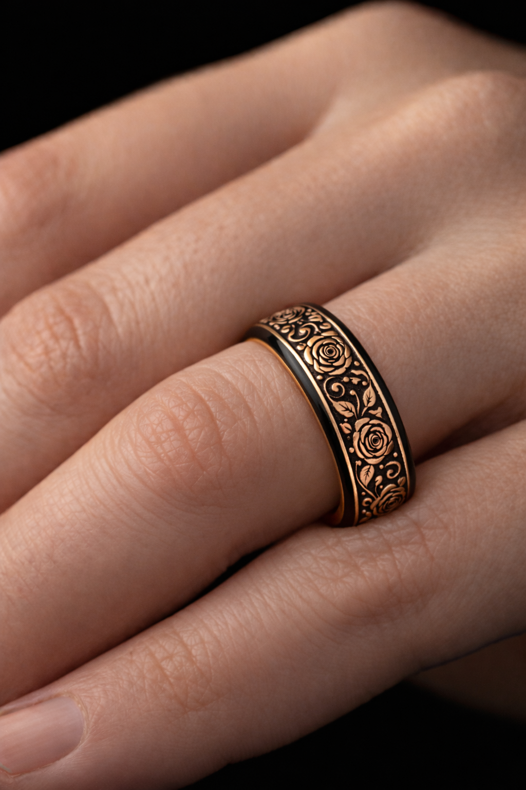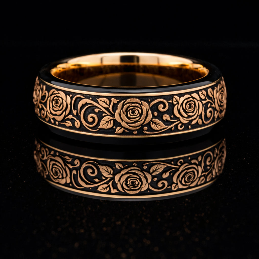 The Midnight Rose blends romance and strength in a striking design. A finely carved gold rose inlay is set into the band and protected by a ring armour coating, symbolising love that is both beautiful and fiercely guarded.