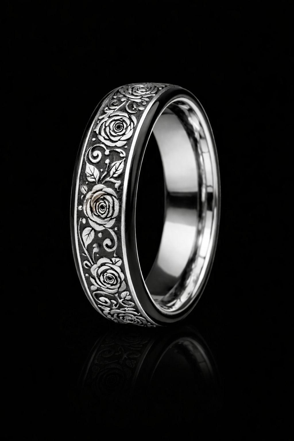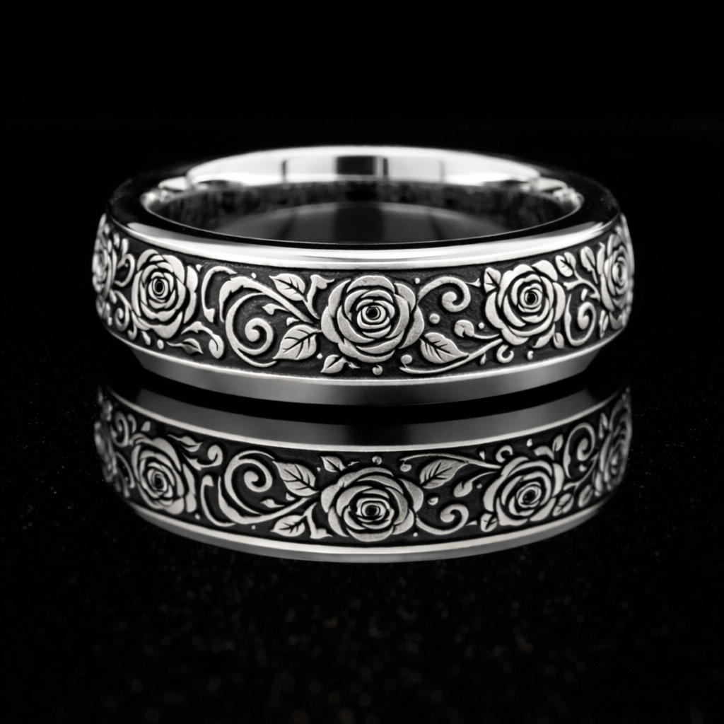The Midnight Rose blends romance and strength in a striking design. A finely carved gold rose inlay is set into the band and protected by a ring armour coating, symbolising love that is both beautiful and fiercely guarded.