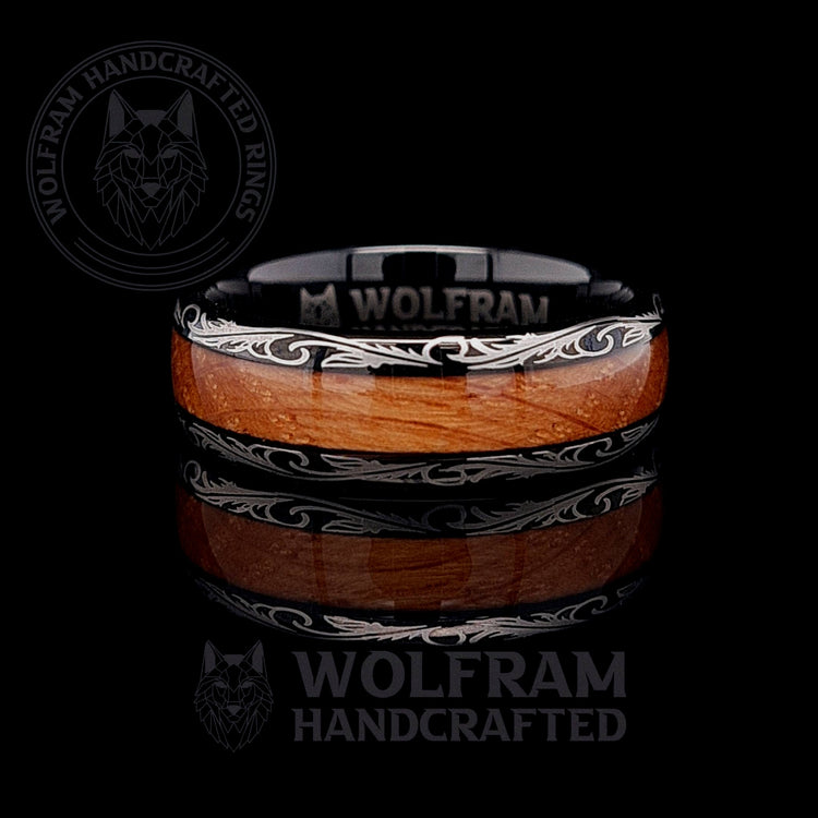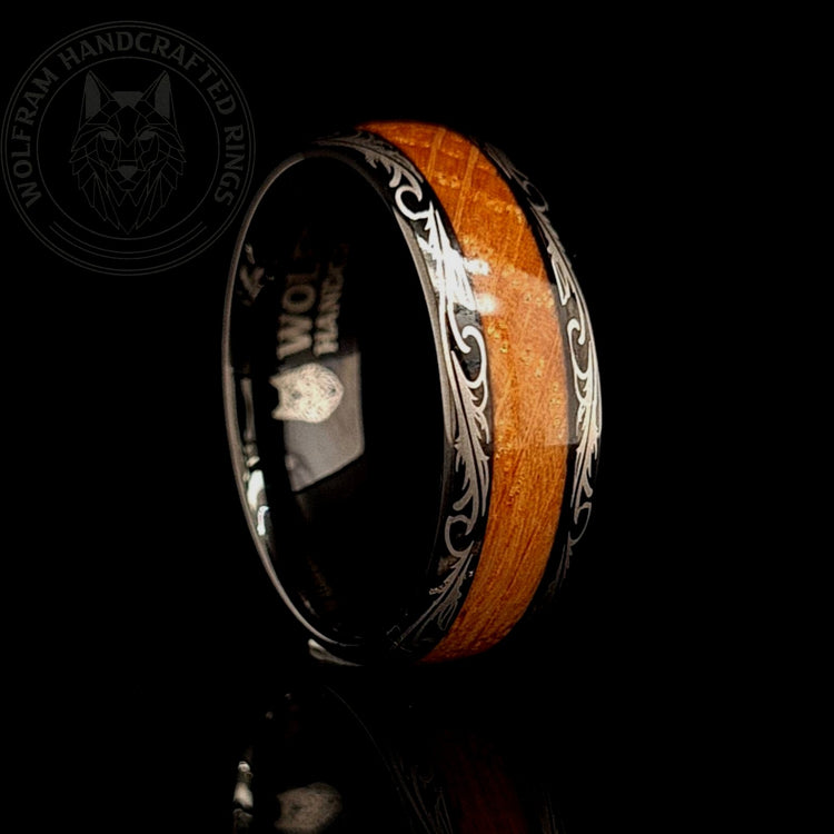 This 8mm wide ring is inlaid with genuine reclaimed Oak Whiskey Barrel wood with beautiful swirling engraving. Since we use real wood the pattern changes slightly for each ring. The wood inlay is protected by our clearcoat Ring Armour™ to protect it from moisture and damage. The 'Winchester is a classy ring fit for any occasion yet tough enough for everyday wear and the perfect conversation starter.